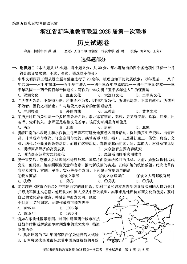 浙江省新阵地联盟2025届高三第一次联考 历史