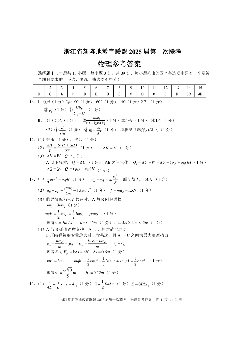 浙江省新阵地联盟2025届高三第一次联考 物理答案