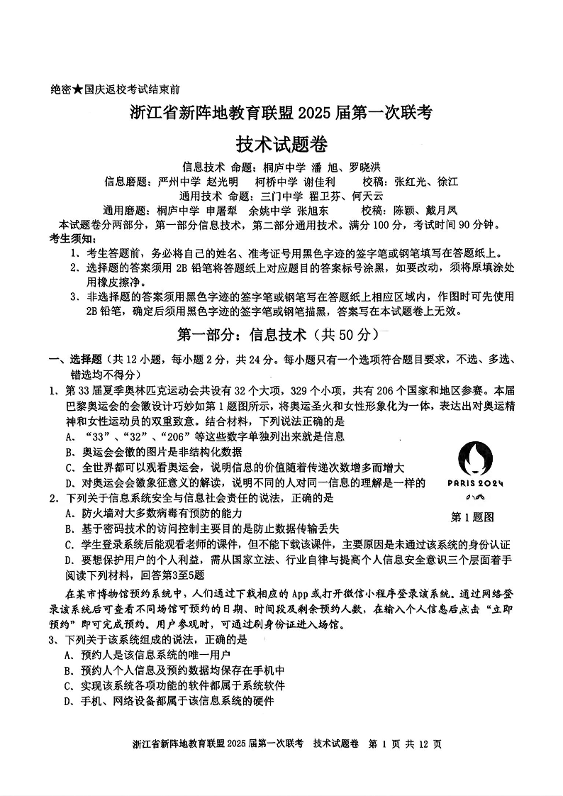 浙江省新阵地联盟2025届高三第一次联考 技术