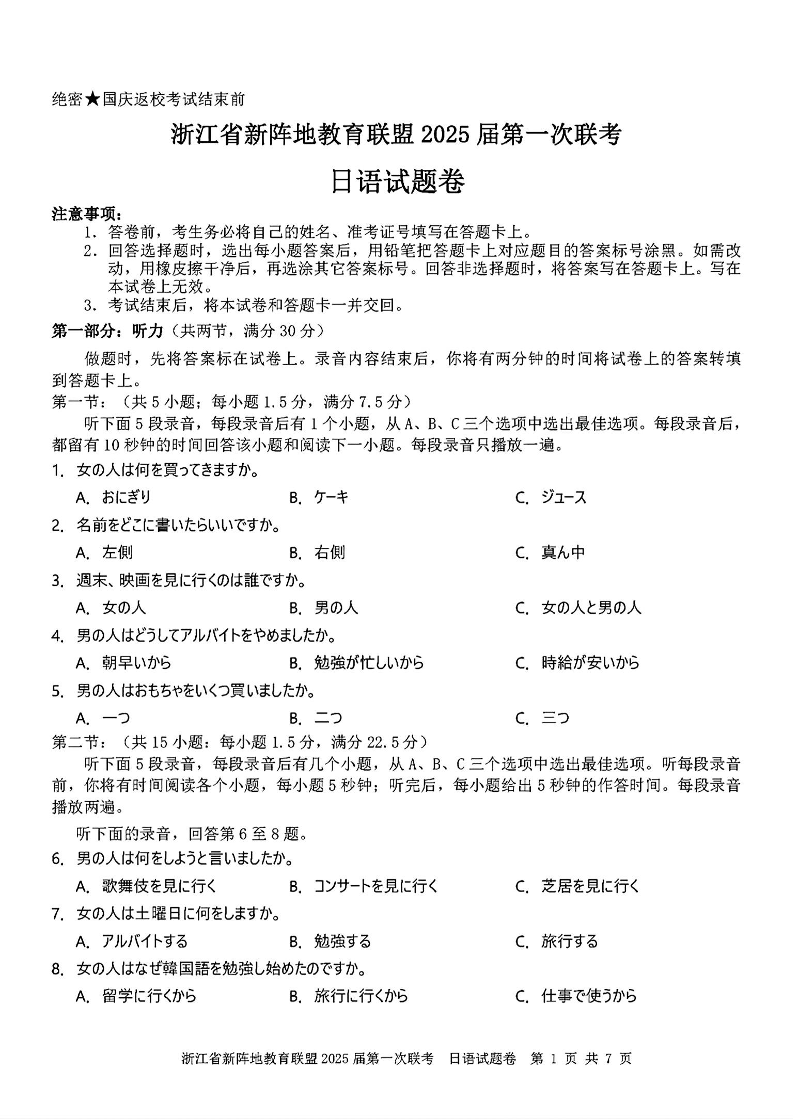 浙江省新阵地联盟2025届高三第一次联考 日语
