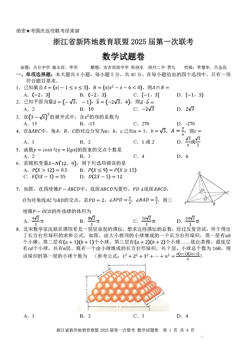 浙江省新阵地联盟2025届高三第一次联考 数学