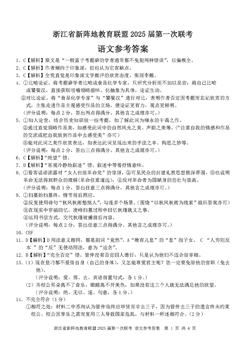 浙江省新阵地联盟2025届高三第一次联考 语文答案