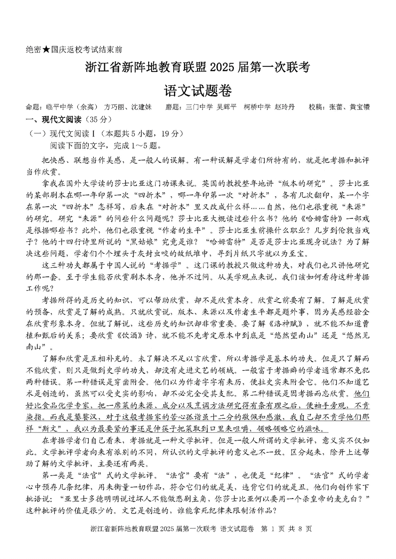 浙江省新阵地联盟2025届高三第一次联考 语文