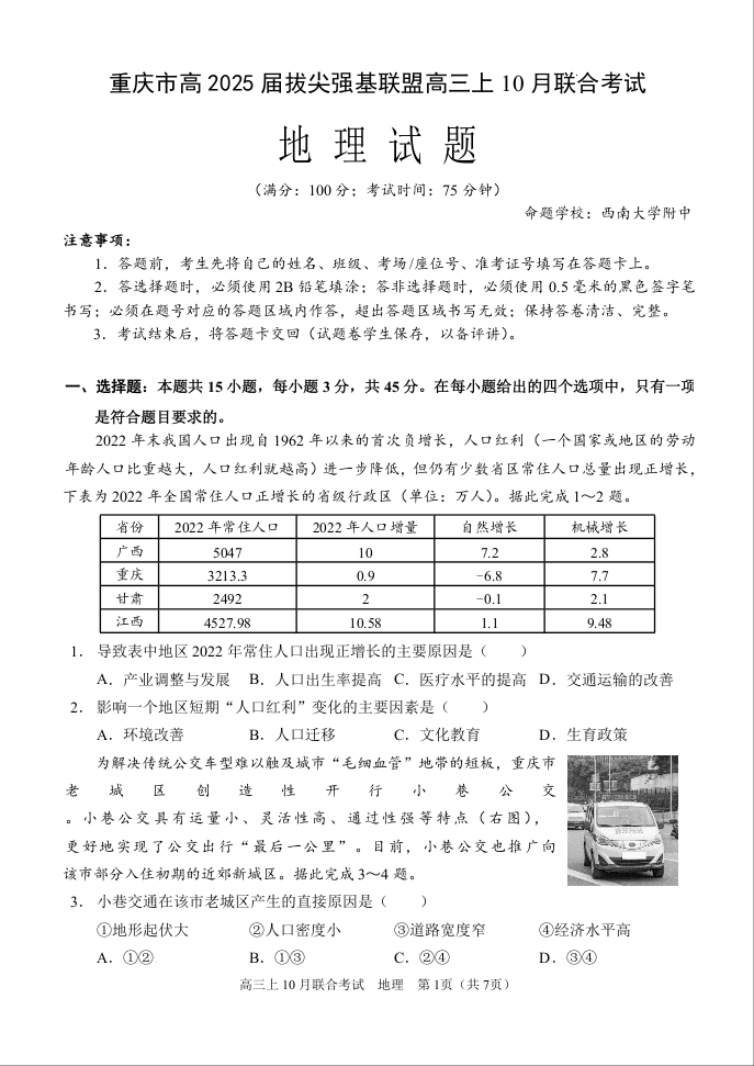 重庆市高2025届拔尖强基联盟高三上10月联合考试 地理