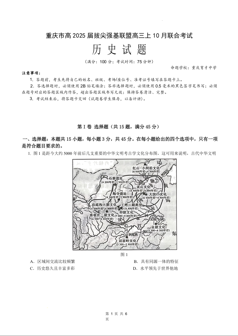 重庆市高2025届拔尖强基联盟高三上10月联合考试 历史