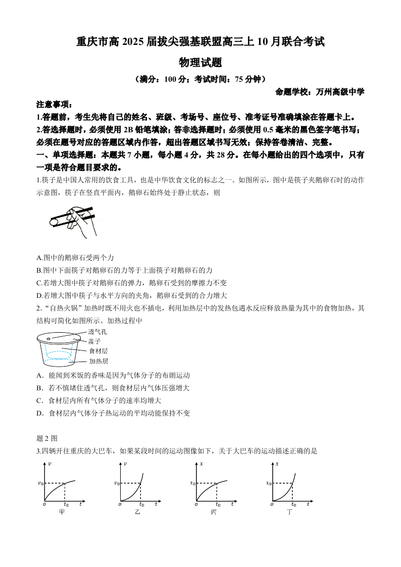 重庆市高2025届拔尖强基联盟高三上10月联合考试 物理