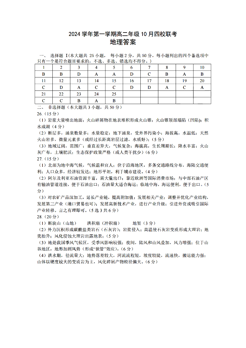 浙江省2024学年第一学期高二年级10月四校联考 地理答案