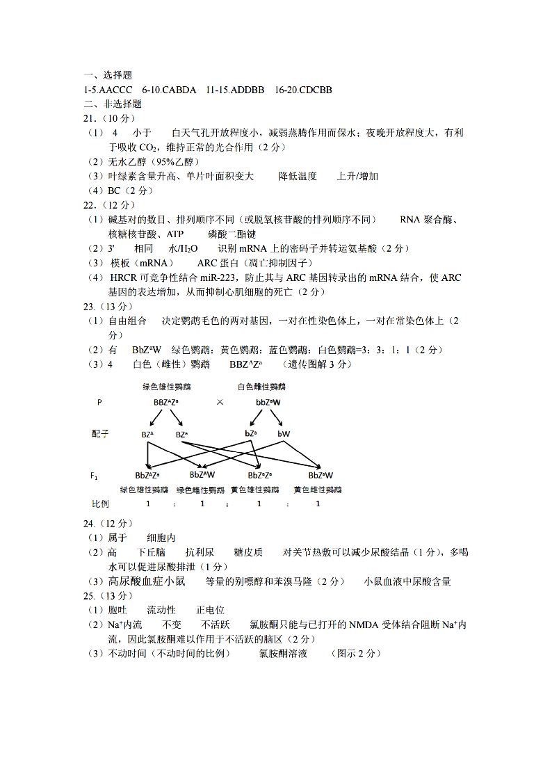浙江省2024学年第一学期高二年级10月四校联考 生物答案
