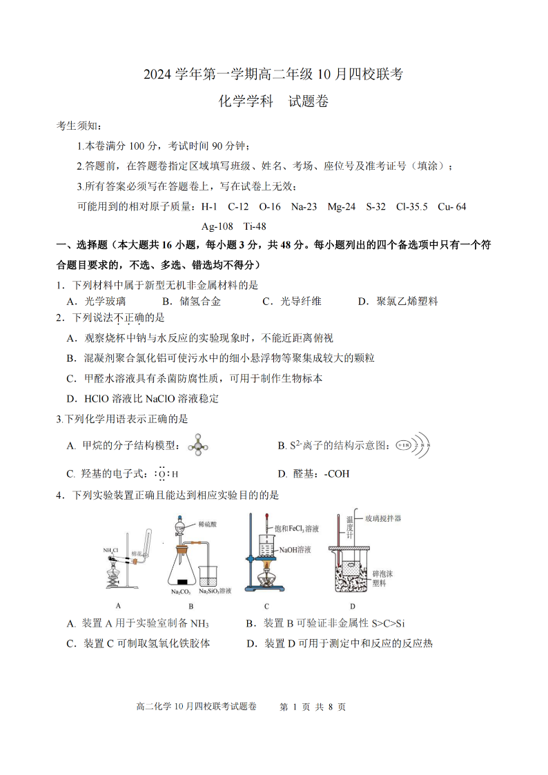 浙江省2024学年第一学期高二年级10月四校联考 化学