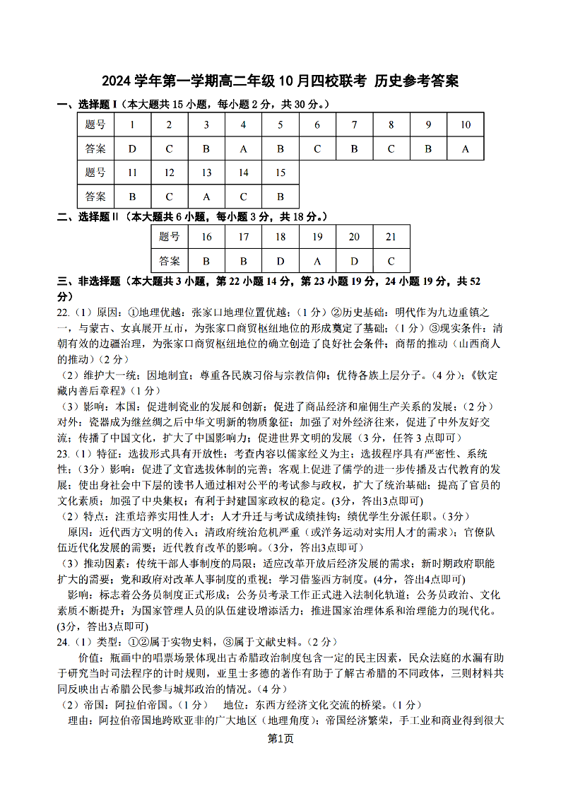 浙江省2024学年第一学期高二年级10月四校联考 历史答案