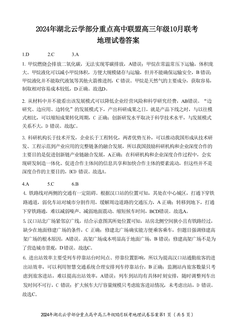 2024年湖北云学部分重点高中联盟高三年级10月联考 地理答案