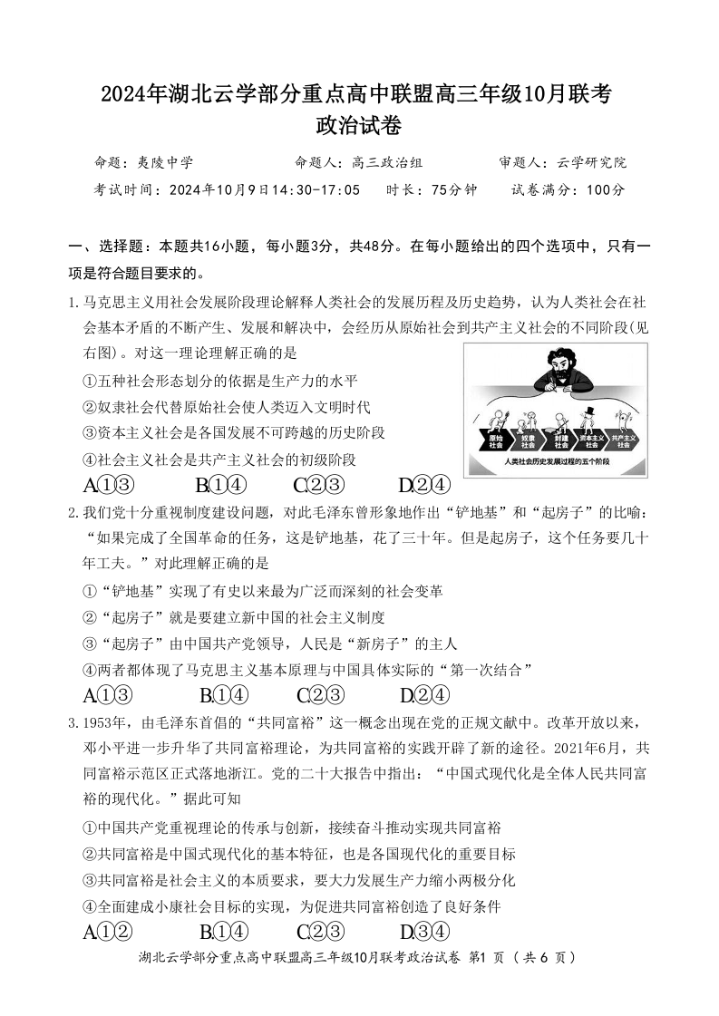 2024年湖北云学部分重点高中联盟高三年级10月联考 政治