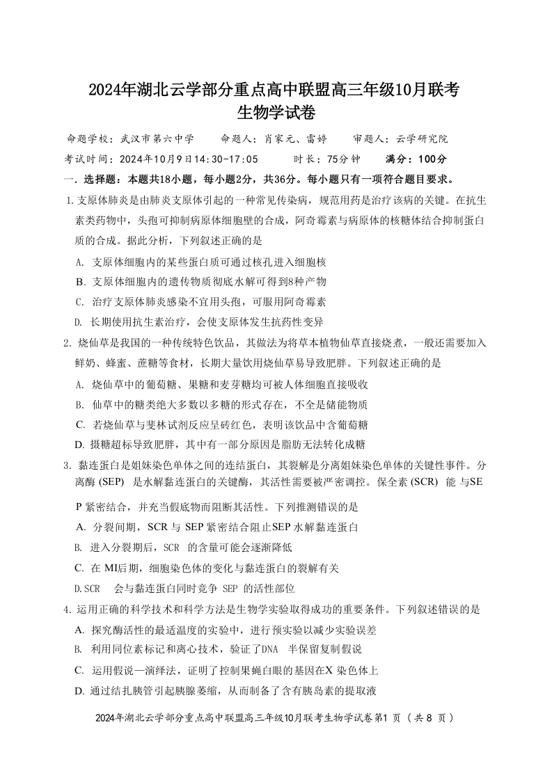 2024年湖北云学部分重点高中联盟高三年级10月联考 生物