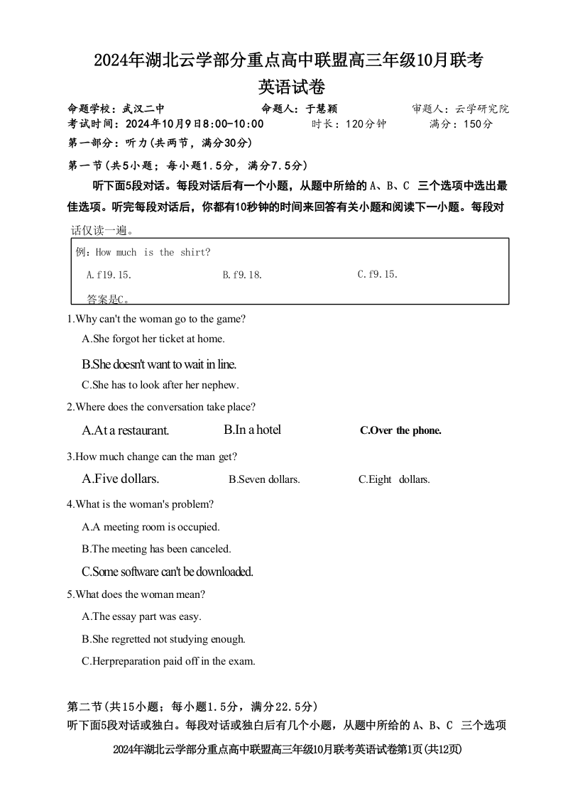 2024年湖北云学部分重点高中联盟高三年级10月联考 英语
