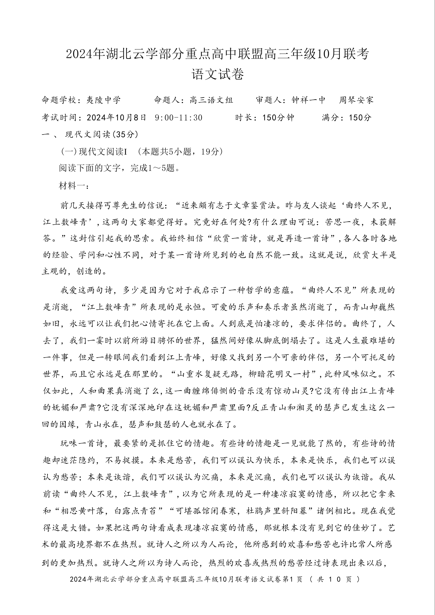 2024年湖北云学部分重点高中联盟高三年级10月联考 语文