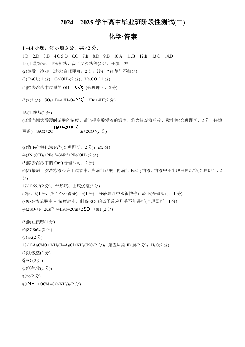 河南省天一大联考2024-2025学年高三上学期阶段性检测(二)化学答案