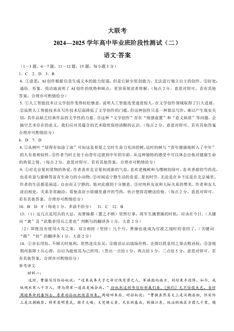 河南省天一大联考2024-2025学年高三上学期阶段性检测(二)语文答案