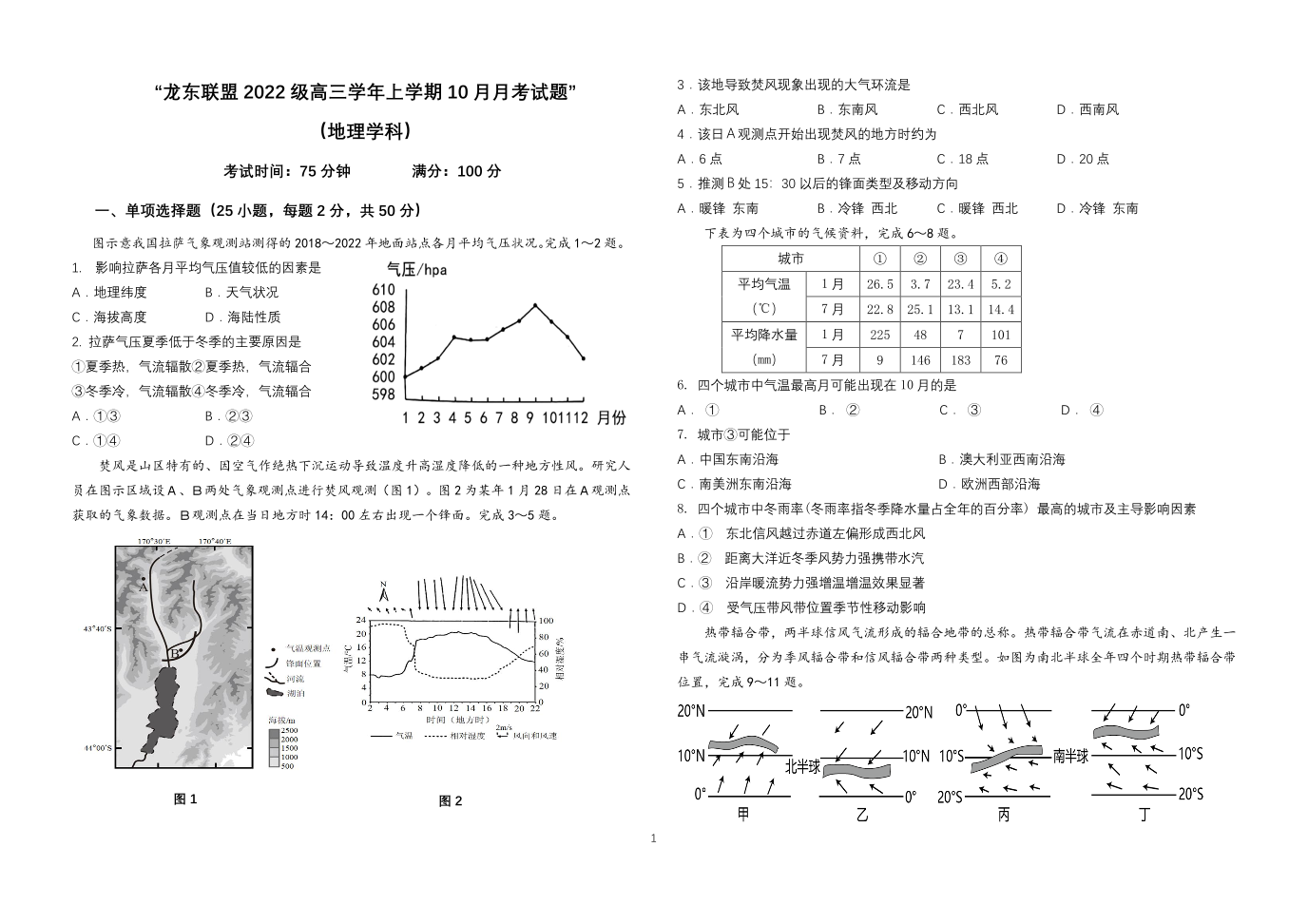 黑龙江省龙东联盟2024-2025学年高三上学期10月月考 地理