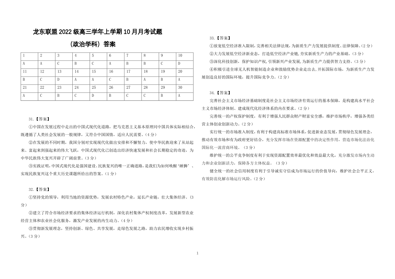 黑龙江省龙东联盟2024-2025学年高三上学期10月月考 政治答案