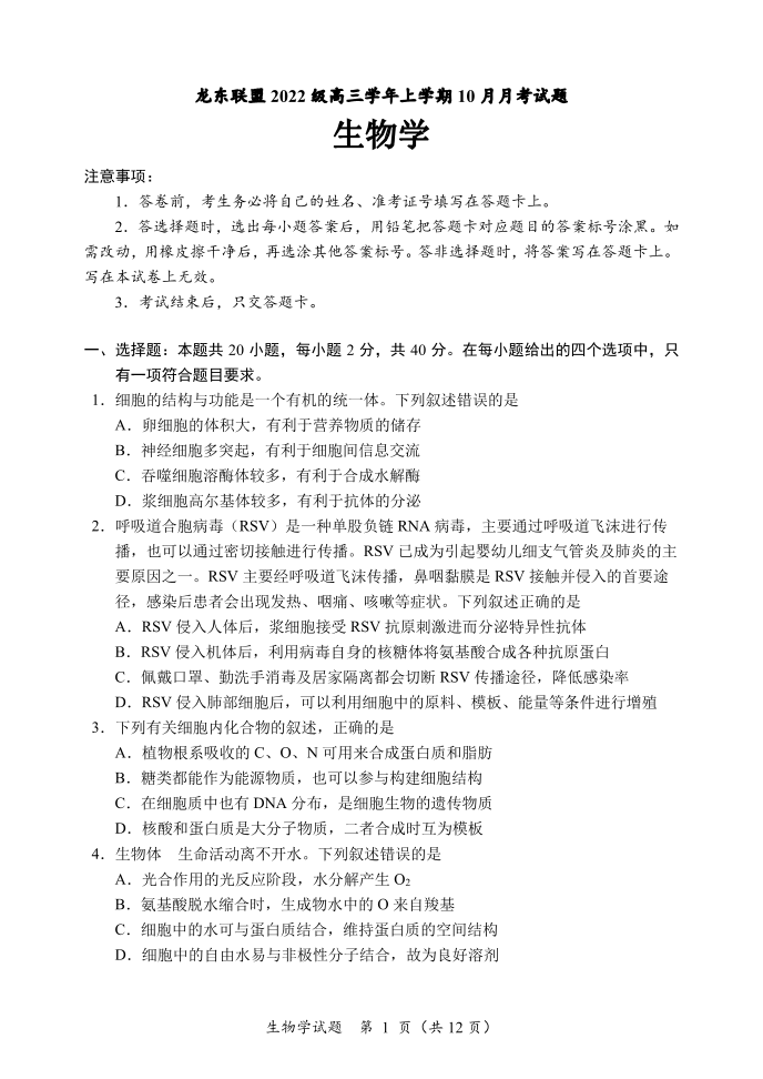 黑龙江省龙东联盟2024-2025学年高三上学期10月月考 生物