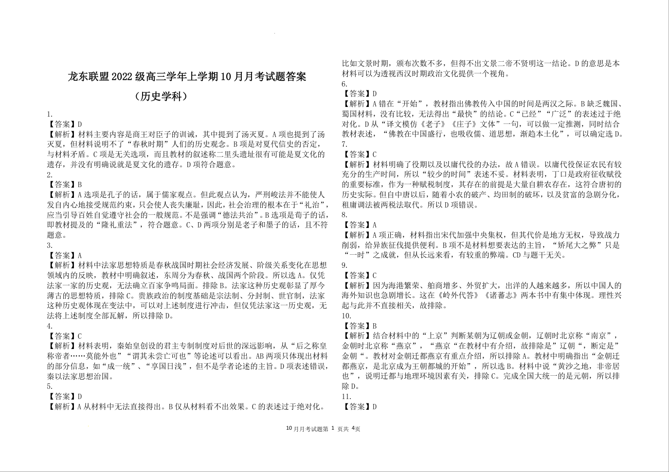 黑龙江省龙东联盟2024-2025学年高三上学期10月月考 历史答案