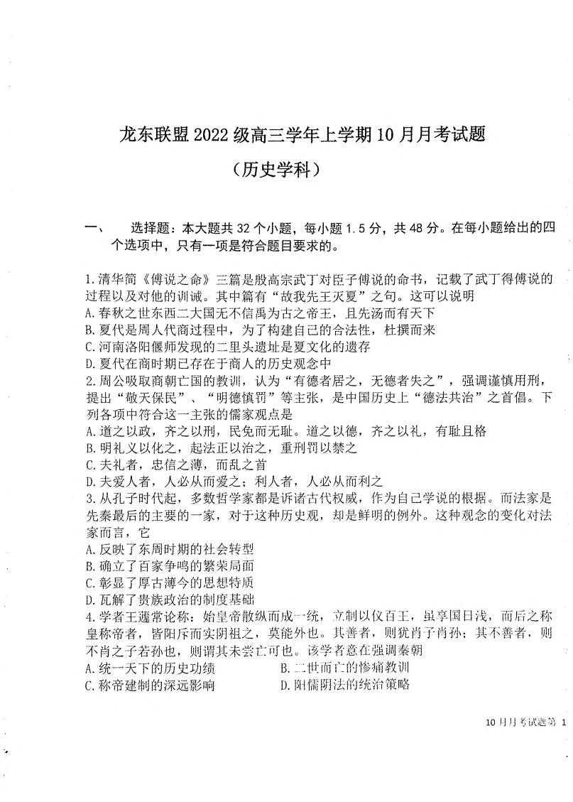 黑龙江省龙东联盟2024-2025学年高三上学期10月月考 历史