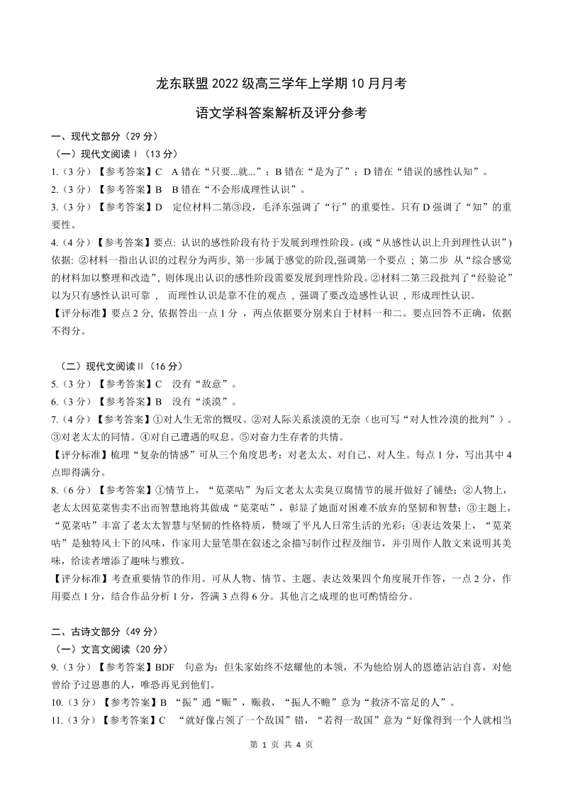 黑龙江省龙东联盟2024-2025学年高三上学期10月月考 语文答案