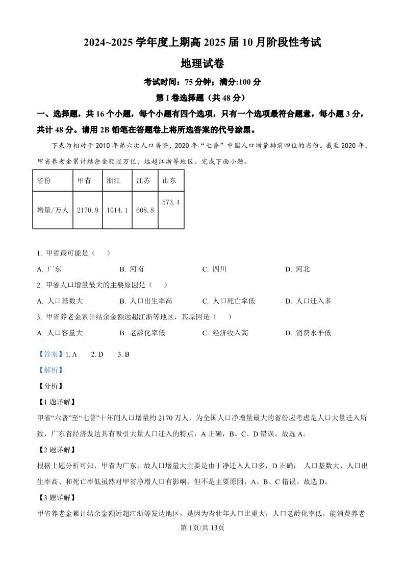 四川省成都市第七中学高2025届10月阶段性测试 地理答案