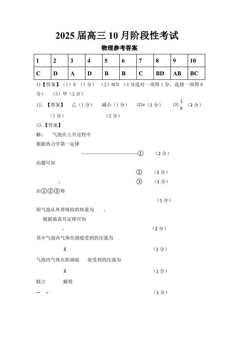 四川省成都市第七中学高2025届10月阶段性测试 物理答案