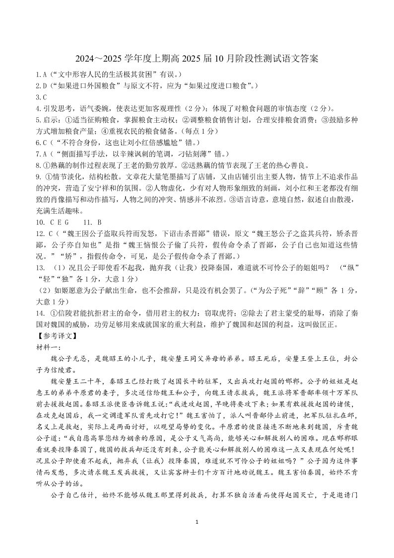 四川省成都市第七中学高2025届10月阶段性测试 语文答案