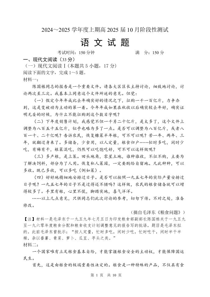 四川省成都市第七中学高2025届10月阶段性测试 语文