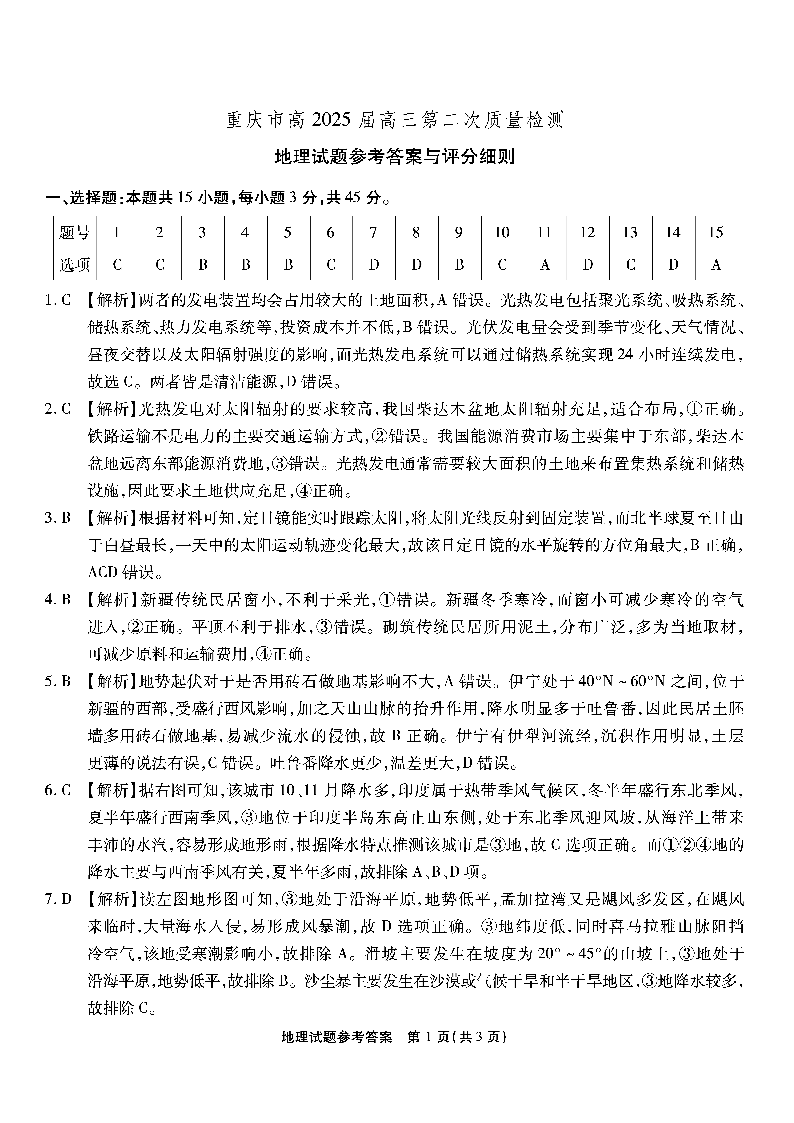 重庆市(南开中学)高2025届高三第二次质量检测 地理答案
