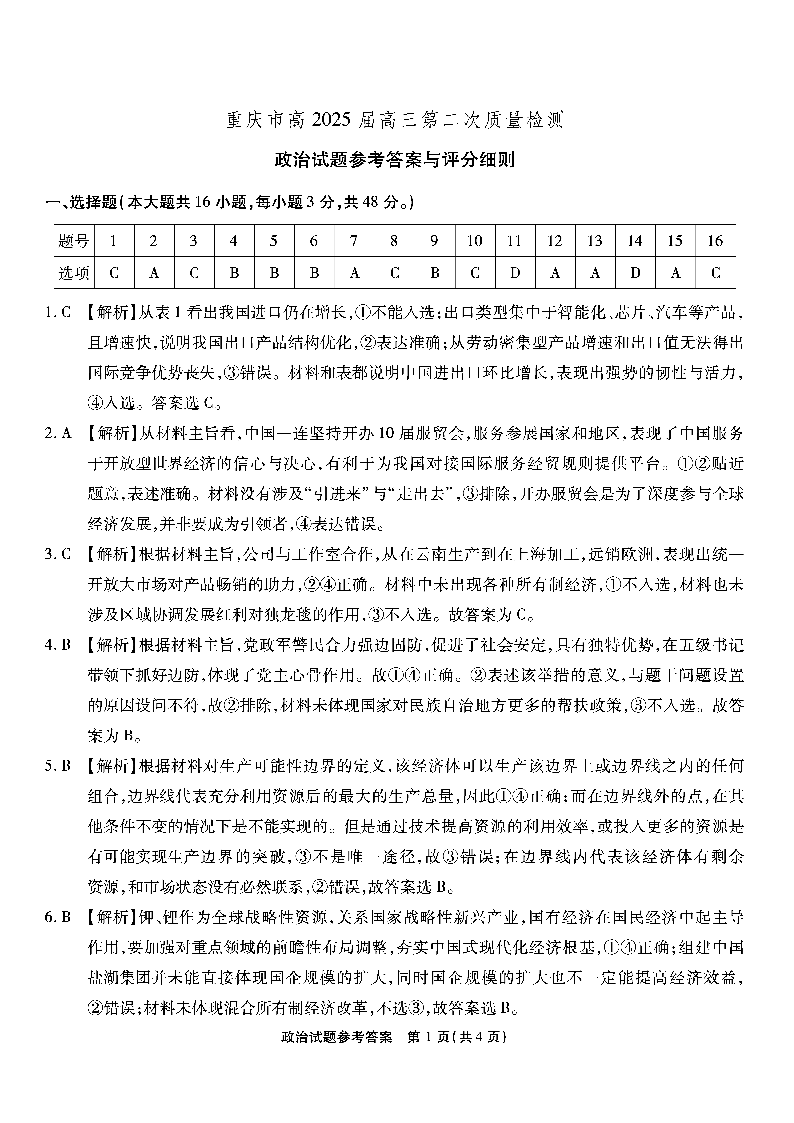 重庆市(南开中学)高2025届高三第二次质量检测 政治答案