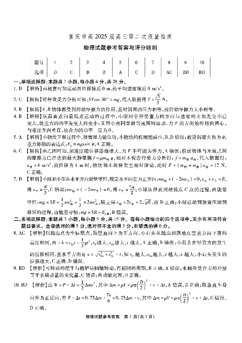 重庆市(南开中学)高2025届高三第二次质量检测 物理答案