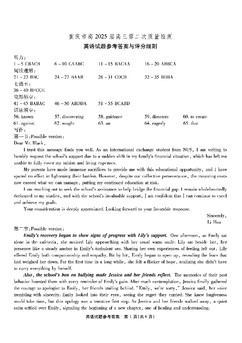 重庆市(南开中学)高2025届高三第二次质量检测 英语答案