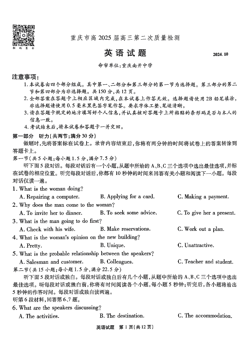 重庆市(南开中学)高2025届高三第二次质量检测 英语