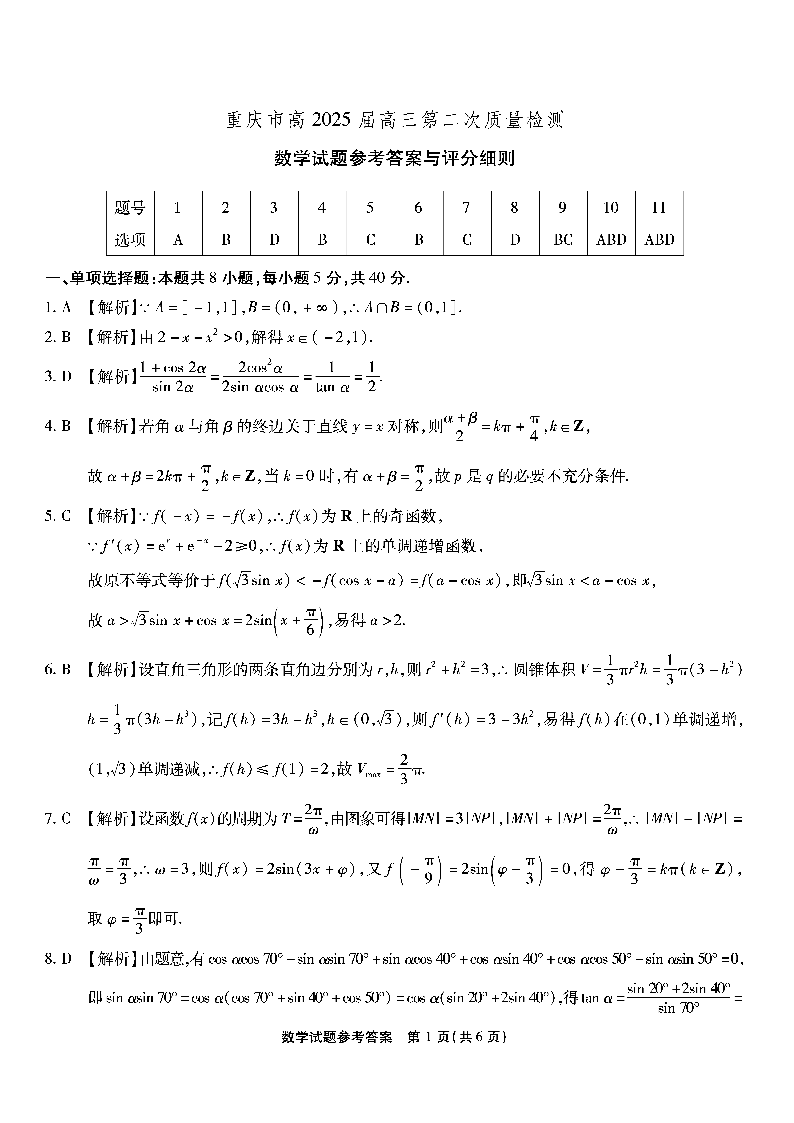 重庆市(南开中学)高2025届高三第二次质量检测 数学答案