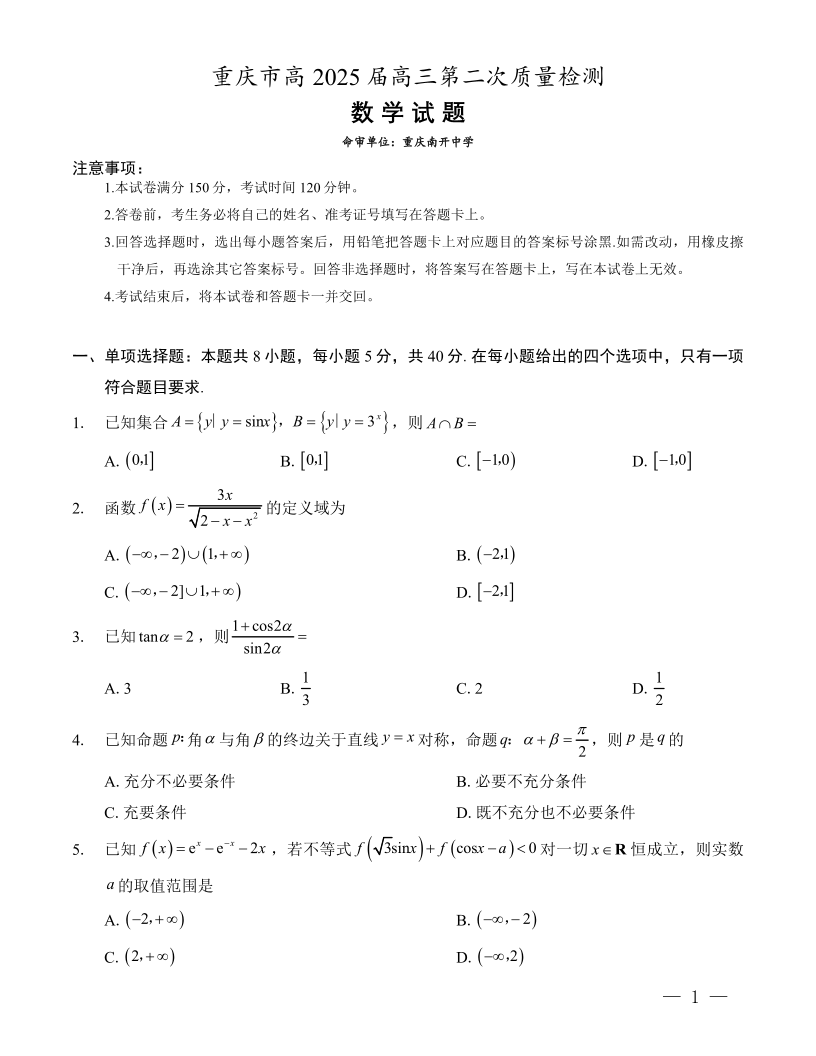 重庆市(南开中学)高2025届高三第二次质量检测 数学