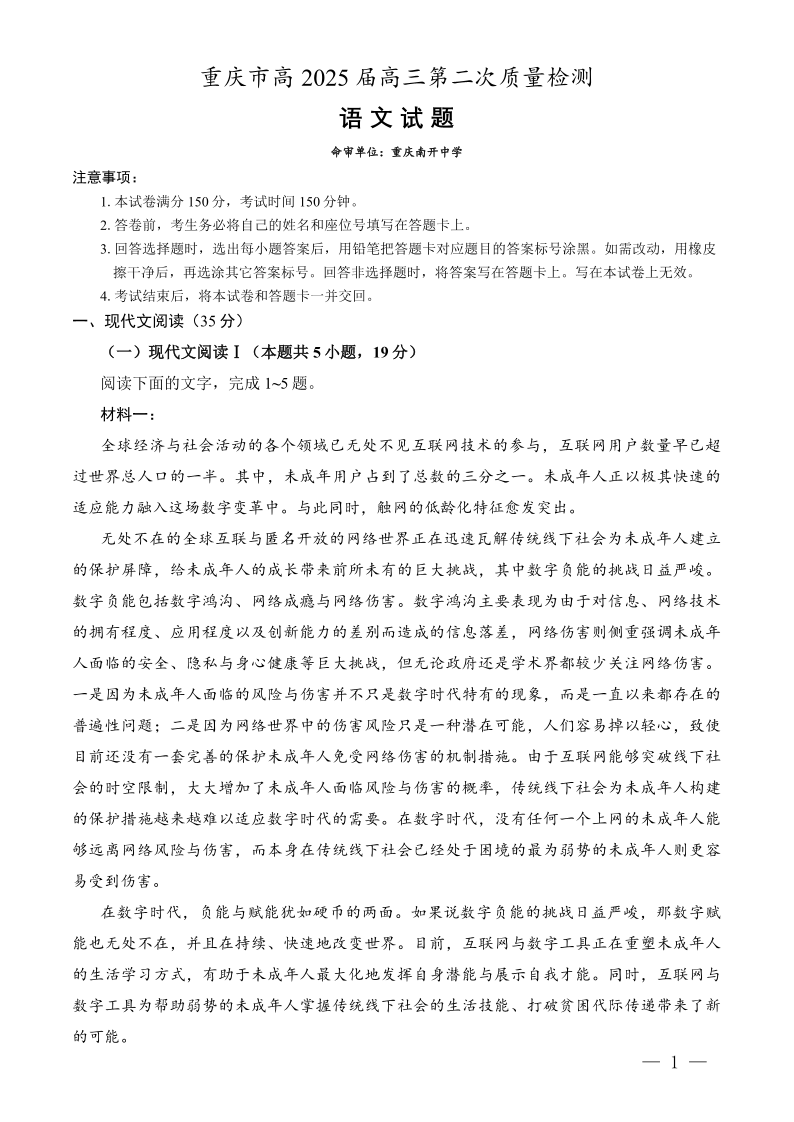 重庆市(南开中学)高2025届高三第二次质量检测 语文