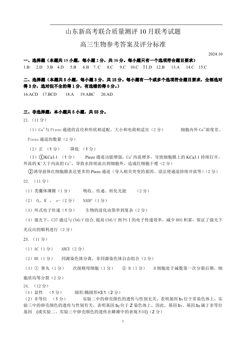 山东新高考联合质量测评高三10月联考试题 生物答案