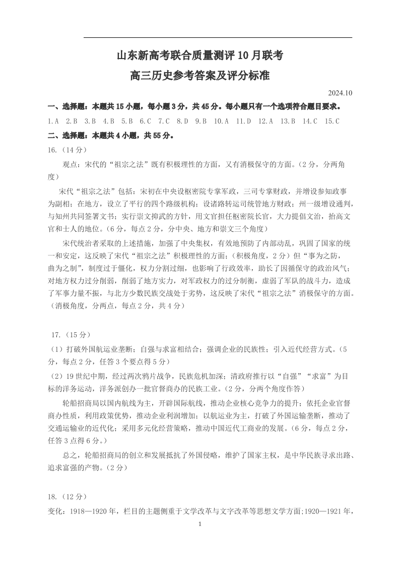 山东新高考联合质量测评高三10月联考试题 历史答案