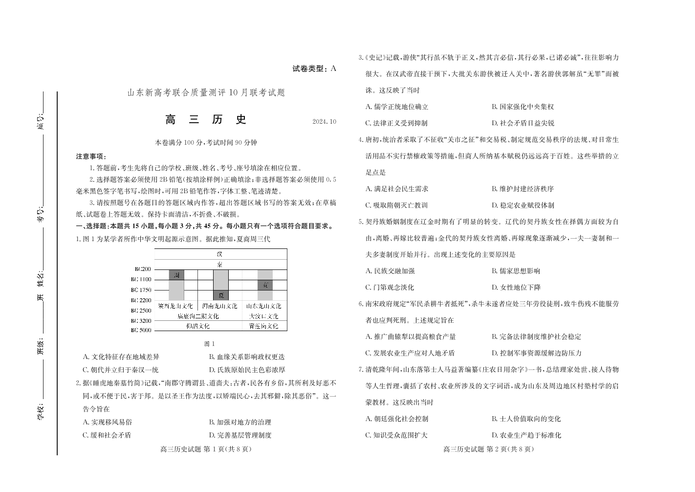 山东新高考联合质量测评高三10月联考试题 历史