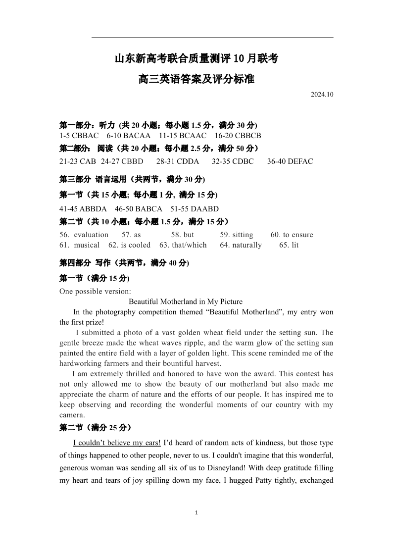 山东新高考联合质量测评高三10月联考试题 英语答案