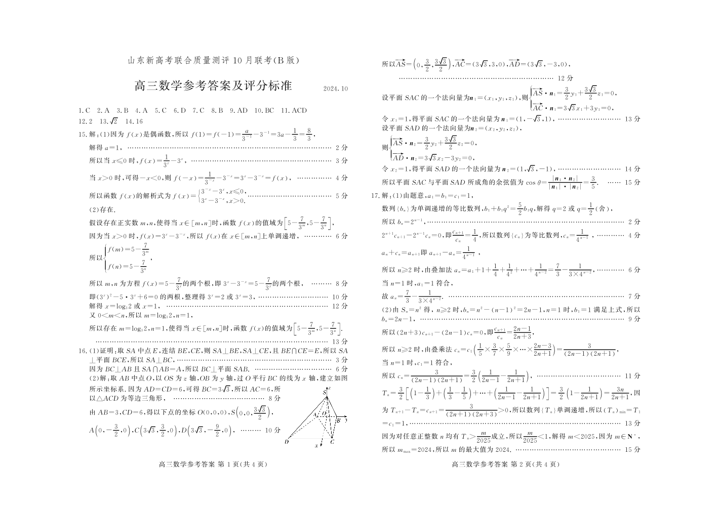 山东新高考联合质量测评高三10月联考试题 数学B答案