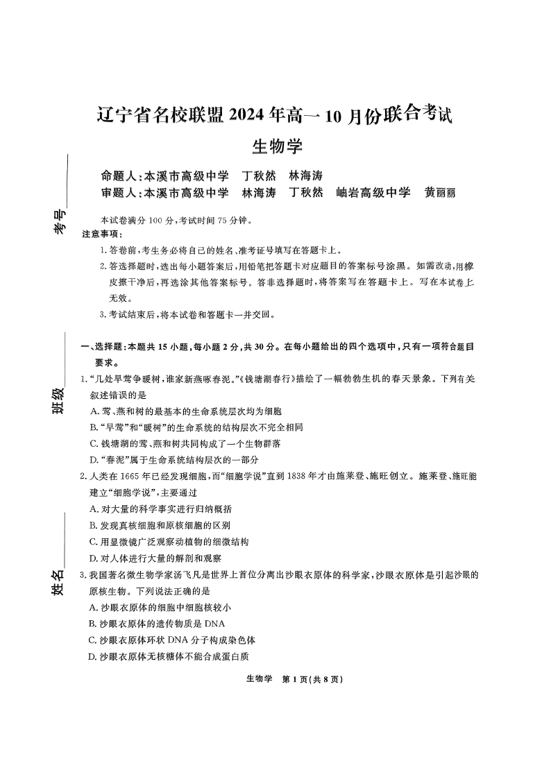 辽宁省名校联盟2024年高一10月份联合考试 生物