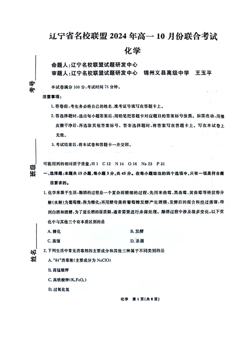 辽宁省名校联盟2024年高一10月份联合考试 化学