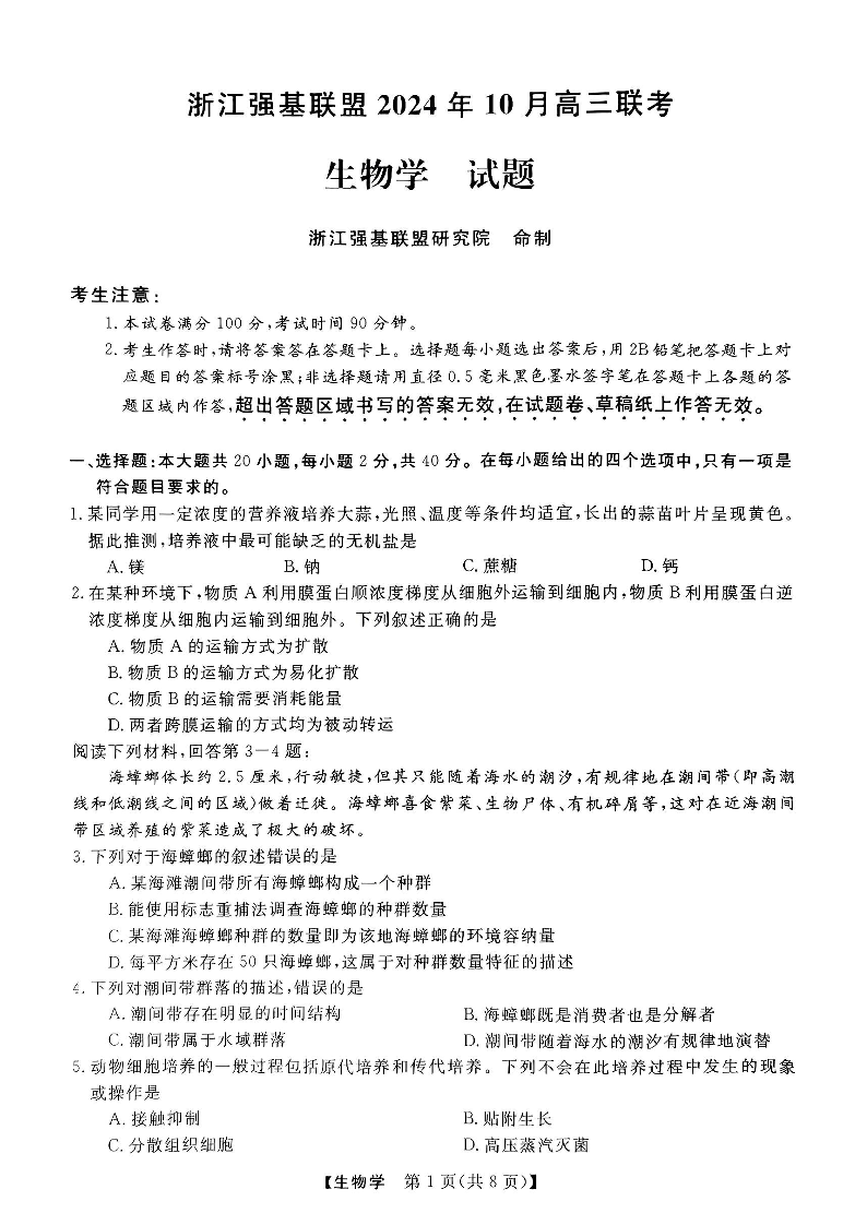 浙江强基联盟2024学年高三10月联考 生物