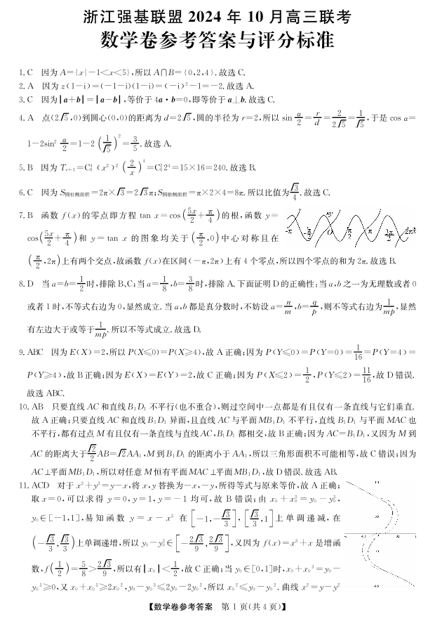 浙江强基联盟2024学年高三10月联考 数学答案