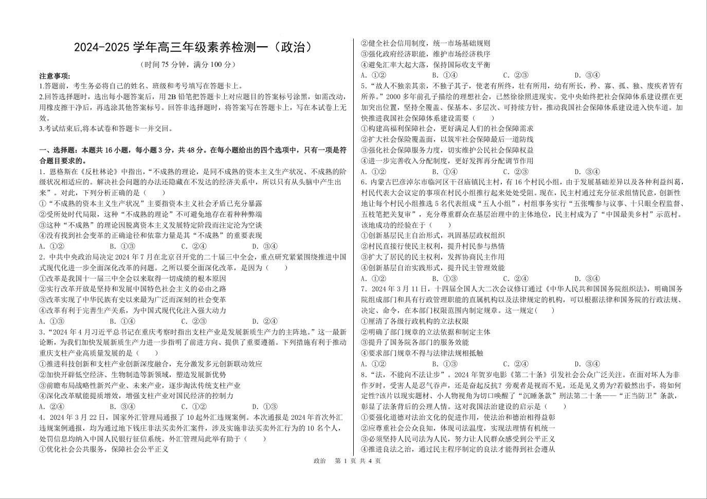 河北省衡水市第二中学2024-2025学年高三上学期素养检测(一)政治