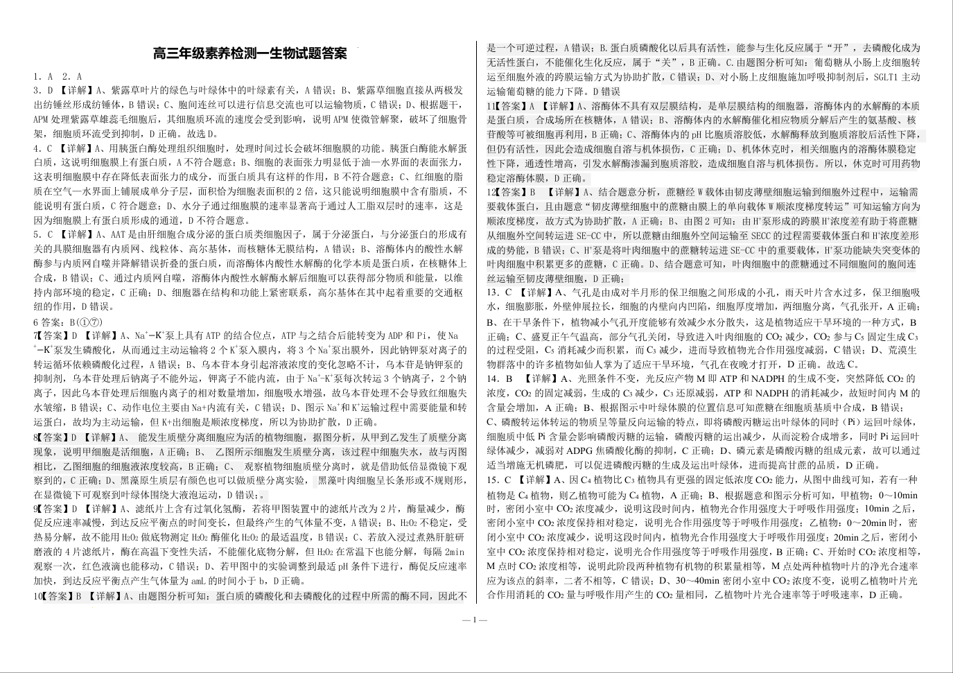 河北省衡水市第二中学2024-2025学年高三上学期素养检测(一)生物答案